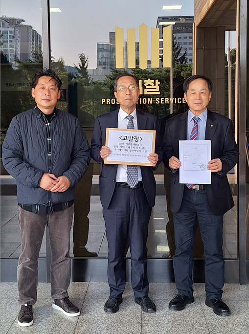 2025년 10월 28일(화) 오후 4시 진평연의 길원평 교수(가운데), 동반교연의 제양규 교수(오른쪽)가 2025 인구주택총조사에서 동성 파트너를 배우자로 등록하게 한 국가데이터처 실무책임자를 서울중앙지방검찰청에 고발하였다.